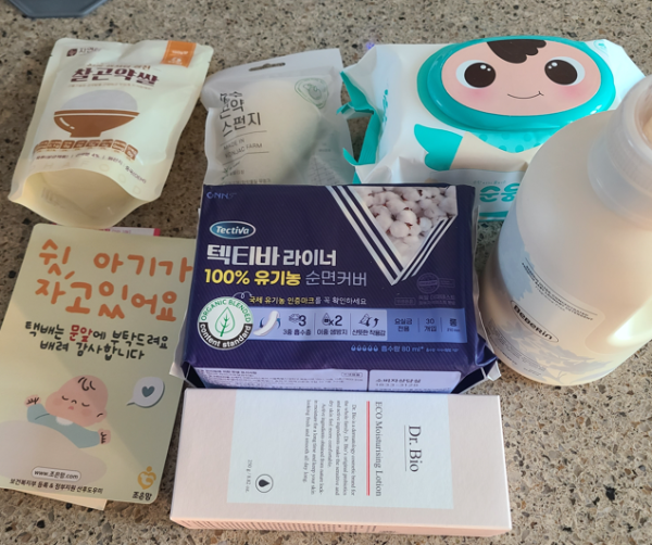 택배를 뜯어보니 아기용 로션, 세제, 물티슈, 곤약스펀지, 곤약쌀 등 쓰임이 좋은 것들로만 알차게 구성되어 있었어요.